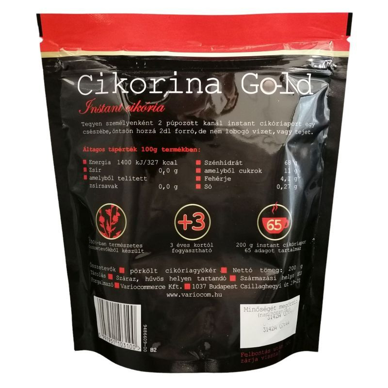 Jellemzők. 3 éves kortól fogyasztható. 100%-ban természetes anyagból, pörkölt cikória gyökérből készült. Elkészítés és felhasználás: egyszerű és könnyű használni. Jól oldódik meleg és hideg italban. Legfinomabb 2 dl meleg tejben feloldva. Cukrot és gabonakivonatot tartalmaz. Tegyen személyenként 2 púpozott kanál instant cikóriaport egy csészébe, öntsön hozzá 2 dl forró, de nem lobogó vizet, vagy tejet.