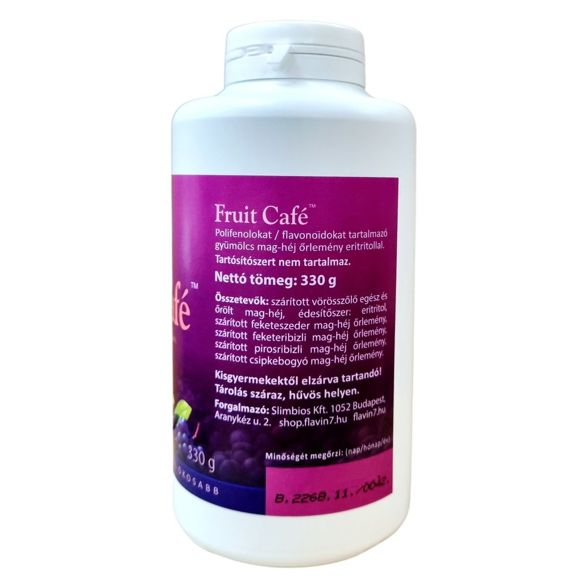 A Fruit Café™ egy polifenolokat és flavonoidokat tartalmazó gyümölcsmag-héj őrlemény, amely természetes édesítőként eritritolt használ, tartósítószert nem tartalmaz.