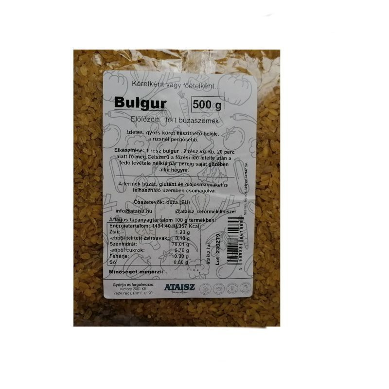 Elkészítése: 1 rész bulgur, 2 rész víz kb. 20 perc alatt fő meg. Célszerű a főzési idő letelte után a fedő levétele nélkül pár percig saját gőzében állni hagyni. Extra tipp: tegyen a főzővízbe Ataisz Vega-Mix-et.