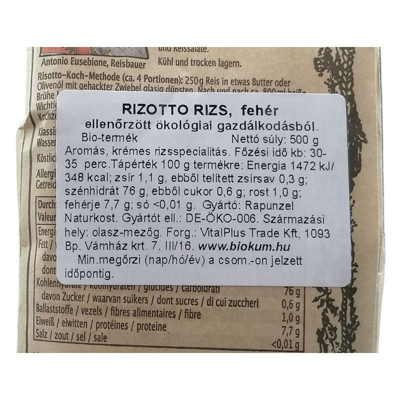 Ellenőrzött ökológiai gazdálkodásból. Készíthető belőle rizottó, tejberizs, vegetárius paella. Főzési idő 50 perc.