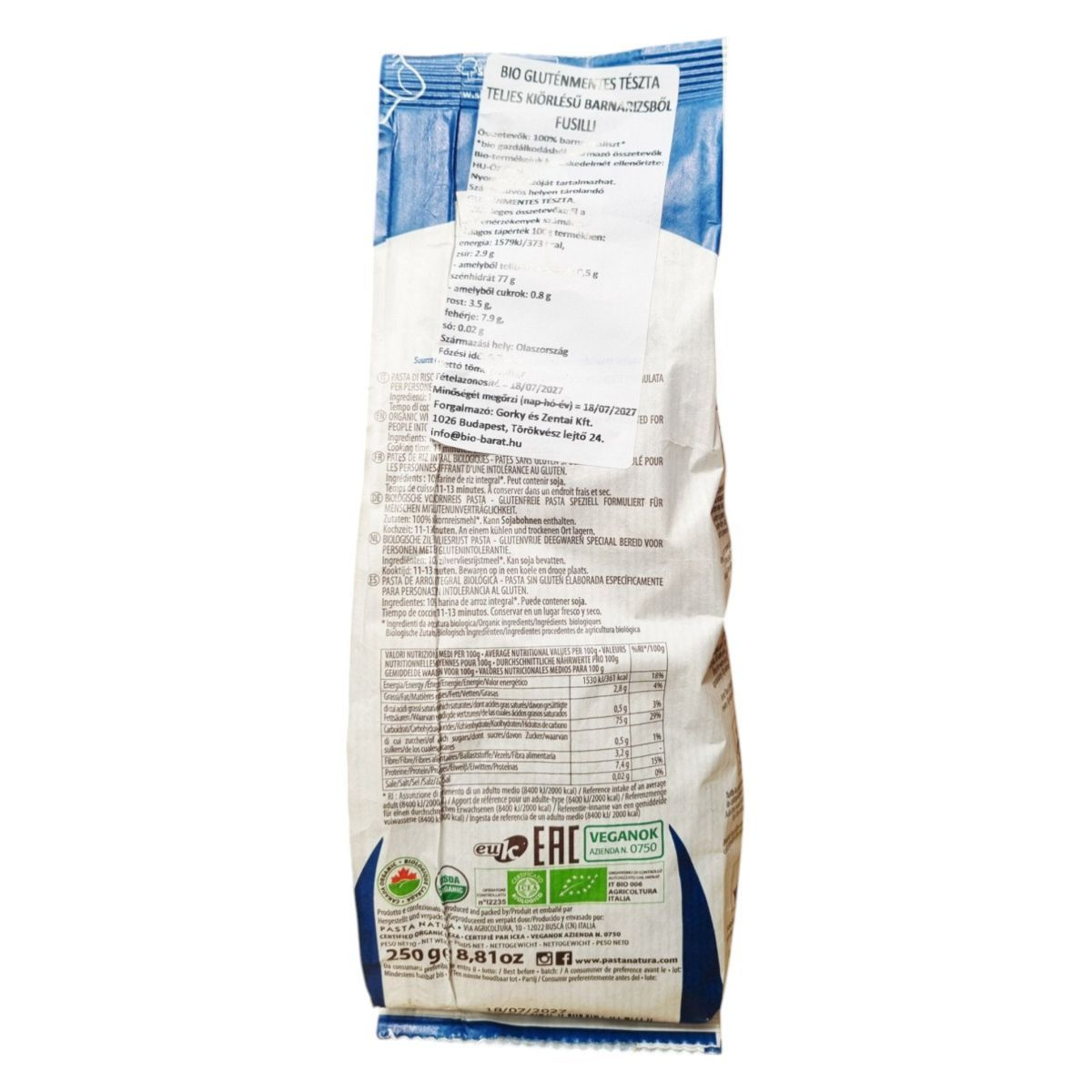 A Pasta Natura® bio, gluténmentes tésztája teljes kiőrlésű barnarizsből készül, ideális választás lehet a gluténérzékenyek számára. Olaszországban készült, és vegán étrendbe is beilleszthető.