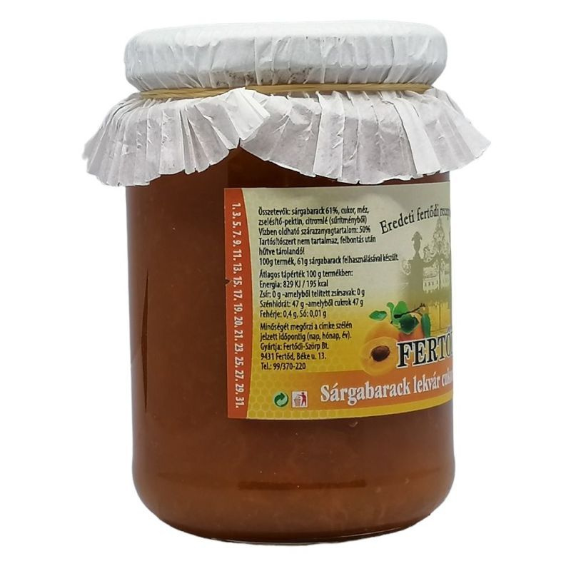 Sárgabarack lekvár mézzel. A sárgabarack a "legklasszikUSAbb"magyar lekvár. Családunk "lekvárfalói" ennél a lekvárnál a legkritikUSAbbak, mert a mérce a "mama" baracklekvárja, amit igazi kihívás elkészíteni. Sok magyar háziasszony nem is gondolja, mennyi értéket tesz családja asztalára egy kis üveg baracklekvárral. A sárgabarack jótékony hatása vitathatatlan. Tartalmaz A-vitamint, ß-karotint, B17 vitamint, káliumot, kalciumot, foszfort, C-vitamint és ként. Segít leküzdeni a baktériumok és vírusok által okozott fertőzéseket. Kiváló alapanyag süteményekhez, krémekhez. A hozzáadott méz csak fokozza ezt a csodás hatást. Eredeti fertődi recept alapján készült sárgabarack-lekvárunk nem tartalmaz semmilyen mesterséges színezéket illetve tartósítószert.