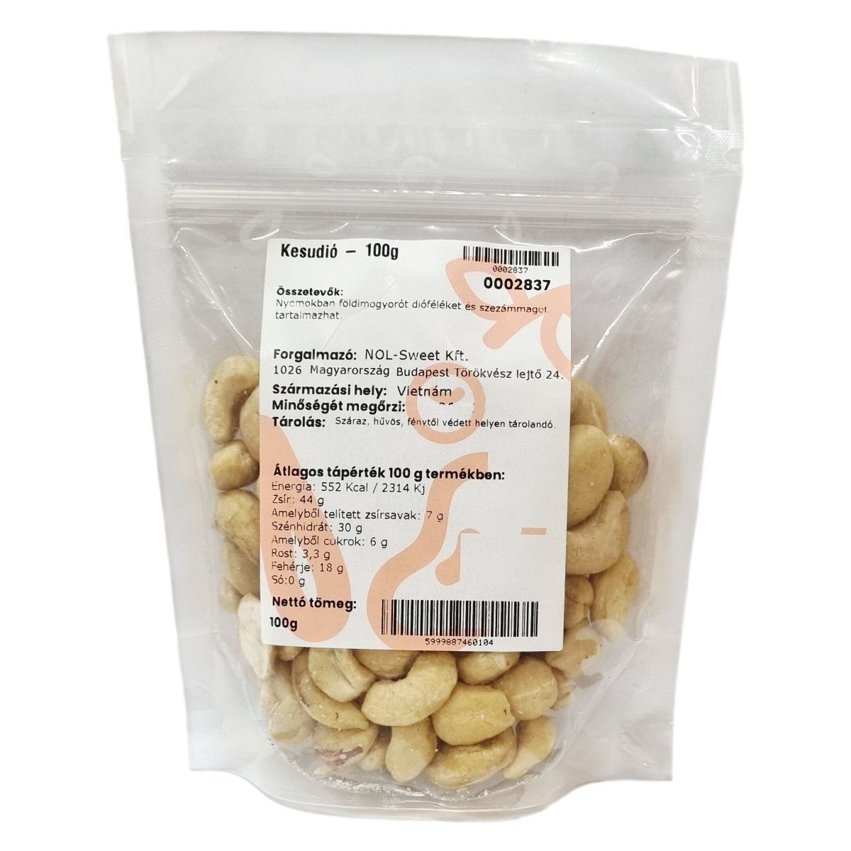 A kesudió eredetileg Vietnamból származik, és 100 g-os kiszerelésben kerül forgalomba. A termék minőségét a feltüntetett ideig megőrzi és praktikus csomagolásban kínálják, amely megkönnyíti a frissesség megőrzését. Az allergén információk szerint a termék előállítása során előfordulhat földimogyoró, más diófélék, valamint szezámmag szennyeződések jelenléte, ezért allergiások figyelmébe ajánlott.