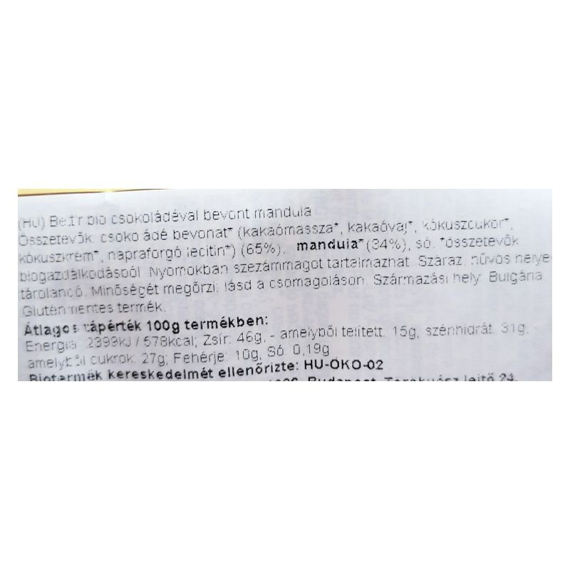 Összetevők:csokoládé bevonat* (kakaómassza*, kakaóvaj*, kókuszcukor*, kókuszkrém*, napraforgó lecitin*) (65%), mandula* (34%), só. *összetevők biogazdálkodásból.
