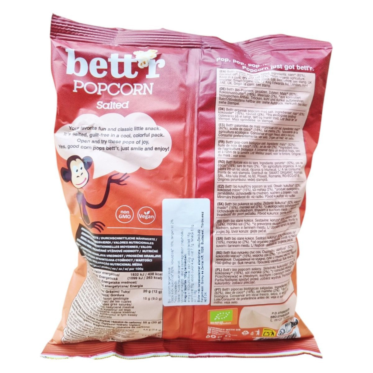A bett'r Popcorn egy bio, vegán snack, amely tengeri sóval ízesített. Kókuszolajjal készül, és színes csomagolásban kapható, hogy bűntudat nélkül élvezhesd.