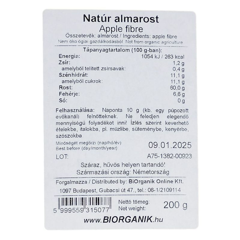 Összetevők: almarost. Nem ökológiai gazdálkodásból. Felhasználása: Naponta 10 g (kb. egy púpozott evőkanál) felnőtteknek. Ne feledjen elegendő mennyiségű folyadékot inni! Származási ország: Németország. Száraz, hűvös helyen tartandó! Gluténmentes.