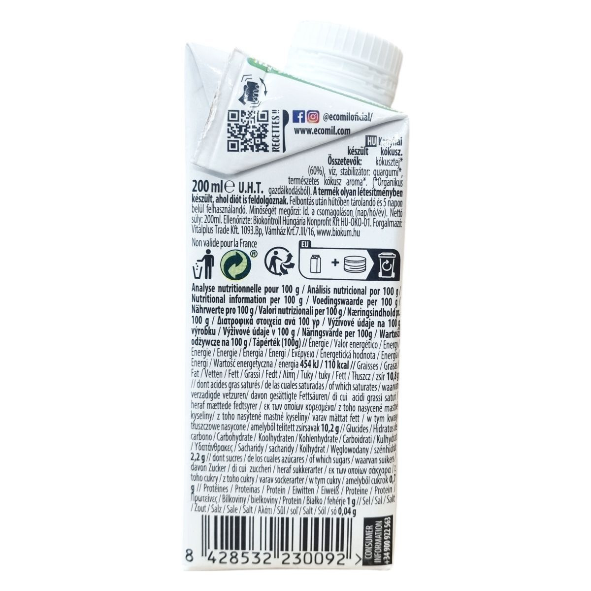 Ecomil bio kókusz főzőkrém glutén- és laktózmentes növényi termék. Vegetáriánus, vega étkezésbe is beilleszthető.