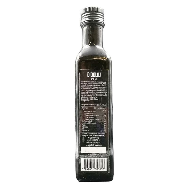 A dióbélből készült olaj magas ásványianyag-tartalommal rendelkezik, melyek közül kiemelkedik a kálium, foszfor, magnézium, a vas, a réz és a cink, de gazdag az antioxidáns hatású A-, és E-vitaminokban is. Remek Omega-6 és Omega-3 forrás. Jótékony hatással van a koleszterinszintre, és az idegrendszerre is. Kiemeli az ételek ízét, kiváló választás salátákhoz, halételekhez. Felbontás után javasoljuk hűtőszekrényben tárolni, így 2-3 hónapig eltartható.