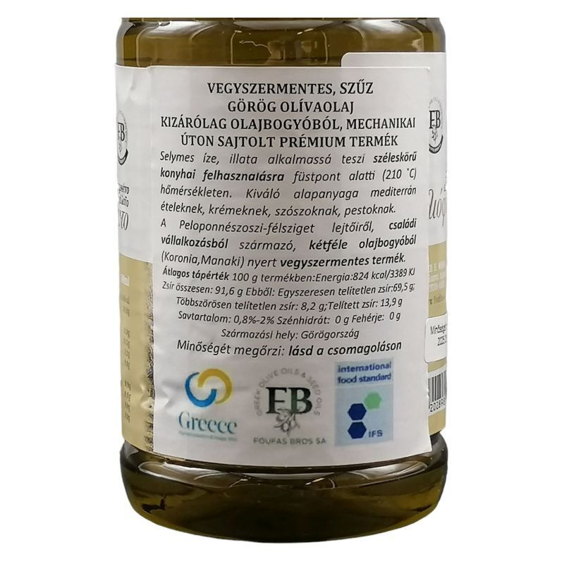 Görögország egyik legjobb olívatermő vidékéről, családi vállalkozásból származó, a Peloponnészoszi-félszigetről szüretelt kétféle zöld olajbogyóból (Koronia és Manaki) nyert vegyszermentes olaj. Ajánljuk bármely konyhai felhasználáshoz füstpont alatti (210 fok) hőmérsékleten. Kiváló alapanyaga krémeknek, szószoknak, pestoknak.