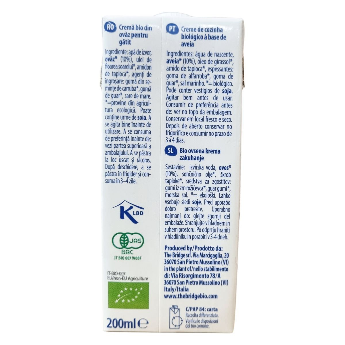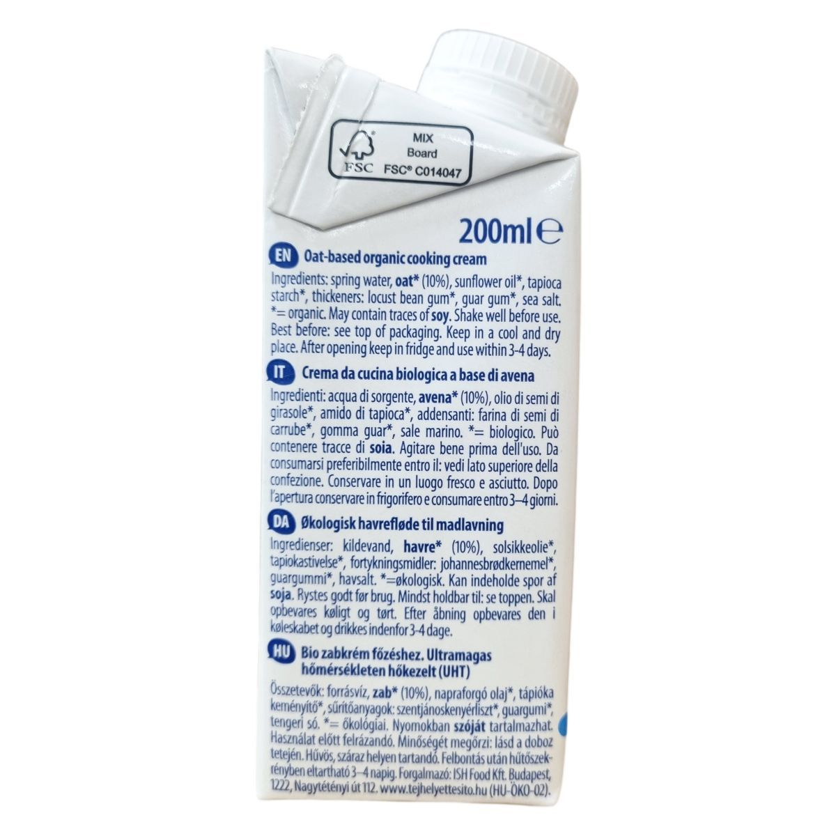 Ez a termék egy bio minősítésű, növényi eredetű főzőkrém, amely zab alapú és teljesen vegán. Az összetevők között szerepel a forrásvíz, zab, napraforgó olaj, tápióka keményítő, valamint természetes sűrítőanyagok, mint a szentjánoskenyérliszt és guargumi, valamint tengeri só. A termék carrageenan nélkül készül, és a Tetra Pak® csomagolás védi a minőségét. Felnyitás után hűtőben kell tárolni, és 3–4 napon belül el kell fogyasztani. A termék tartalmazhat szójamaradványokat, ezért allergiásoknak figyelmes használat javasolt.