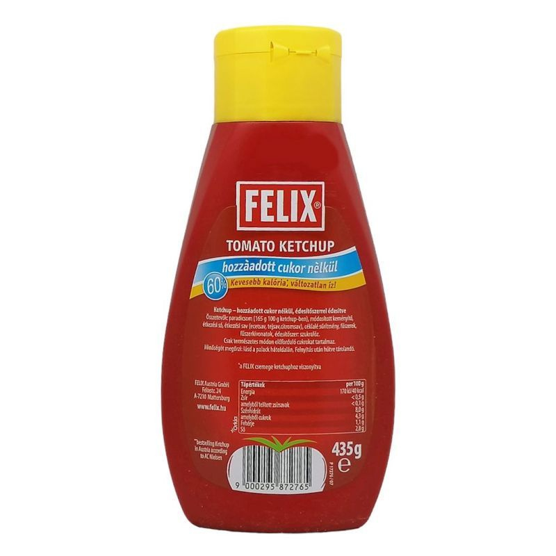 Csak természetes módon előforduló cukrokat tartalmaz. Átlagos tápérték 100 g termékben: Energia: 170 kJ/40 Kcal, zsír: <0,5 g -ebből telített: <0,1 g, szénhidrát: 8,0 g -ebből cukrok: 4,3 g, fehérje: 1,1 g, só: 2,8 g. Tárolási információ: szobahőmérsékleten, felbontás után hűtőszekrényben tárolandó! Származási hely: Ausztria. Összetevők: paradicsom (165 g 100 g ketchup-ben), módosított keményítő, étkezési só, étkezési sav (ecetsav, tejsav, citromsav), céklalé sűrítmény, fűszerek, fűszerkivonatok, édesítőszer: szukralóz.