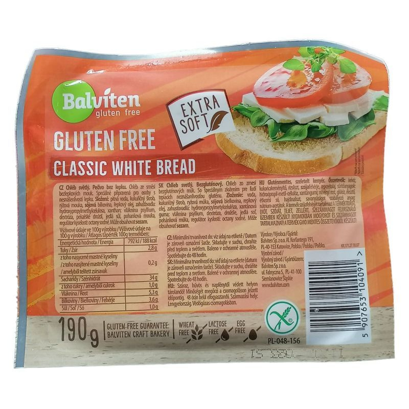 Glutén-, laktóz-, tej-, tojásmentes szeletelt fehér kenyér.