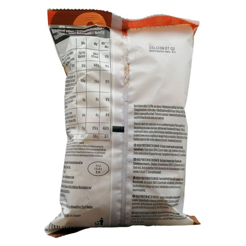 Forpro High Protein Keto snack classiC- 40 g. Eredeti íz, vagy 0% cukor és szénhidrát? Nem kell választanod! megtalálod mindkettőt a Forpro High Protein Keto snack termékünkben! Itt, a Forpro nál mindig a legújabb és leginnovatívabb termékeket biztosítjuk, amelyek segítik az egészséges, magas fehérjetartalmú étrendet. Ismerd meg és add hozzá étrendedhez ezt a vadonatúj Forpro High Protein Keto snack terméket, mely kiemelkedően magas fehérje és 0% cukor és szénhidrát tartalommal rendelkezik. Remek alternatívája a klasszikus chipseknek. Meg kell, hogy kóstold! A Forpro High Protein Keto snack pörköléssel készült sertés bőr darabokat tartalmaz, amik egyedülálló, könnyű, eredeti ropogós ízt biztosítanak számodra. A remek íz nem az egyetlen dolog, amit ezek az eredeti falatok kínálnak, adagonként 22,8 g fehérjét biztosítanak. Mind az erő-, mind az állóképességi programok során segíti a strukturális és kontraktilis fehérjék fejlődését. A Forpro High Protein Keto snack teljesen szénhidrátmentes, ketogén diétába könnyen beilleszthető. Használd a Forpro High Protein Keto snack terméket bárhol és bármikor az egészséges, magas fehérjetartalmú étrended részeként. Ha szereted a chipseket és más sós snackeket, de kerülöd a fogyasztásukat az alacsony szénhidráttartalmú étrend miatt - a Forpro High Protein Keto snack igazi alternatívát nyújthat. Rágcsáld napközben esetleg fogyaszd egy jó filmhez vagy egészíts ki főétkezéseidet ezekkel az egyedi termékünkkel! ideális kiegészítő, ha állandóan mozgásban vagy. Felhasználás: a nap bármely szakaszában. A csomag 1 adagot tartalmaz.