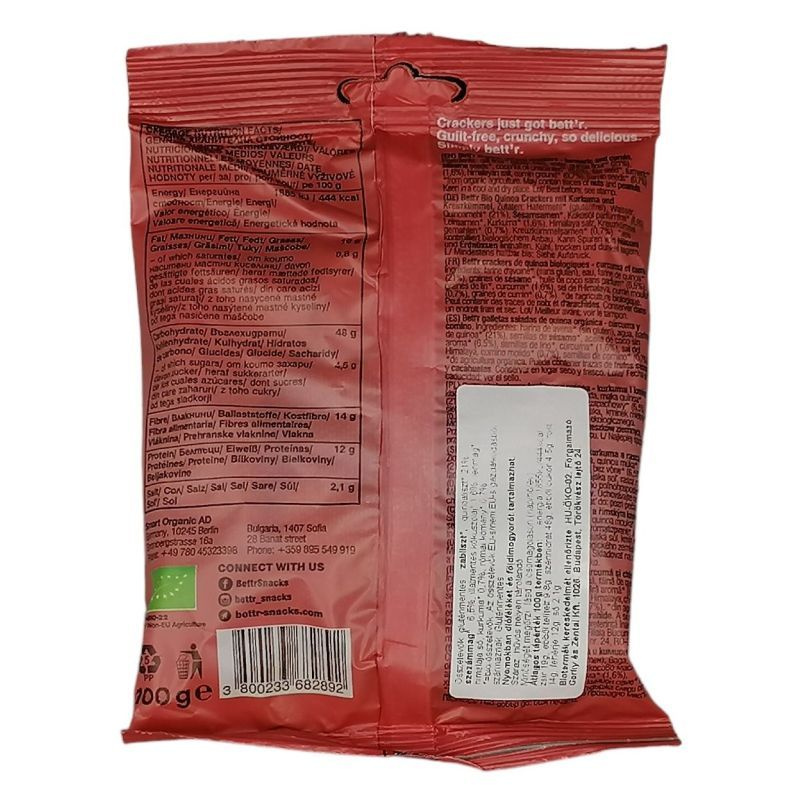 Összetevők: Gluténmentes zabliszt*, quinoa liszt*(30%), szezámmag*(9%), kókuszolaj*(9%), lenmag*, himalája só, kurkuma* (2,3%), római kömény* (1,8%). *összetevők biogazdálkodásból.