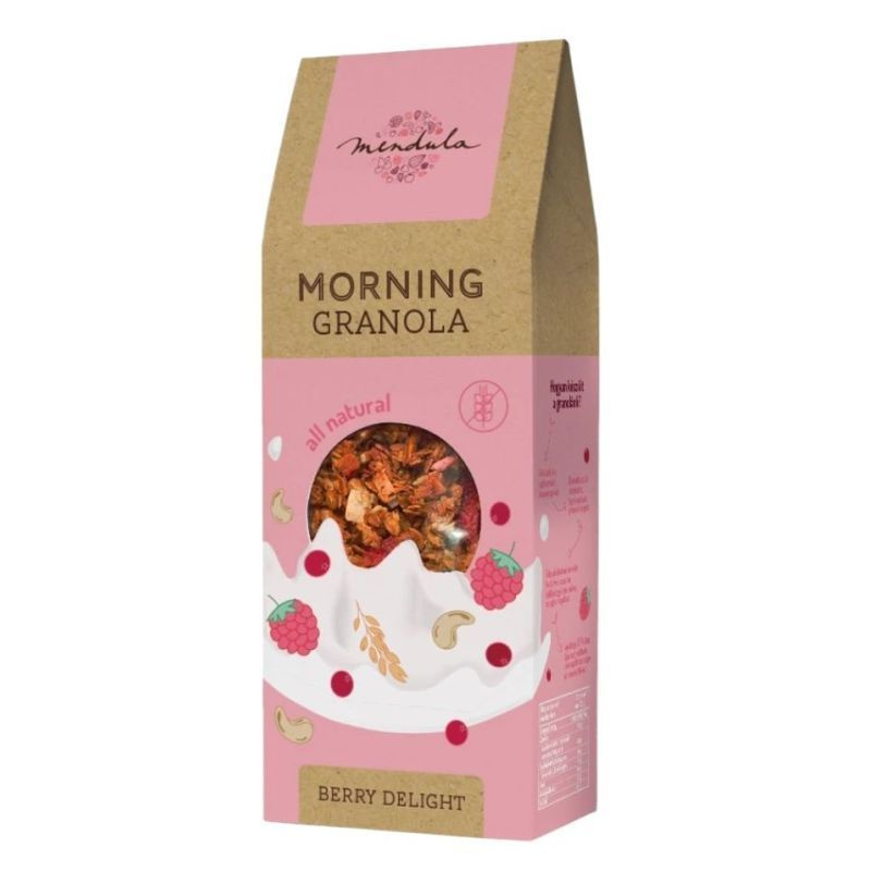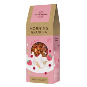 Málnás-vörösáfonyás granola - ropogós gyümölcsös finomság kesudióval. Málnás granola termékünk a nyár ízeivel és rózsaszín gyümölcseivel csempész egy kis varázslatot reggeleidbe. Mosolyra hangol, és hosszú órákra biztosítja a szükséges energiát, ha dolgozni indulsz, edzésre szaladsz, vagy épp a gyerekek készülnek a suliba. A kényelmesebb hétvégi reggeliknek is ellenállhatatlan alkotóeleme, önmagában, vagy egy többfogásos brunch részeként.