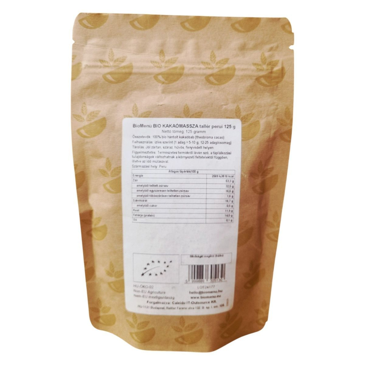 A BioMenu BIO KAKAÓMASSZA tallér egy prémium minőségű, 100% bio hántolt kakaóbabból készült termék, amely Peruból származik. Az organikus, nyers és vegán termék ideális választás azok számára, akik természetes és tiszta kakaó ízélményre vágynak. A termék 125 grammos kiszerelésben kapható, és 12-25 adagot tartalmaz, attól függően, hogy 5-10 grammos adagokat használunk fel. A termék táplálkozási tulajdonságai változhatnak a környezeti feltételektől függően, illetve az idő múlásával. Tárolása jól zártan, száraz, hűvös, fényvédett helyen ajánlott. A termék HU-ÖKO-02 engedéllyel rendelkezik, és nem-EU mezőgazdaságból származik.