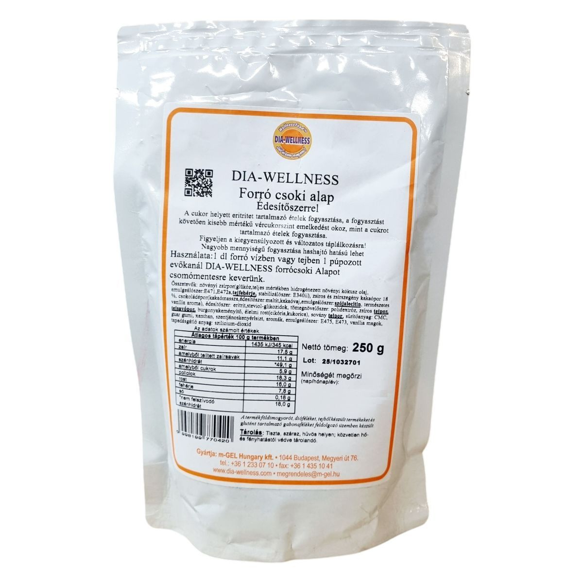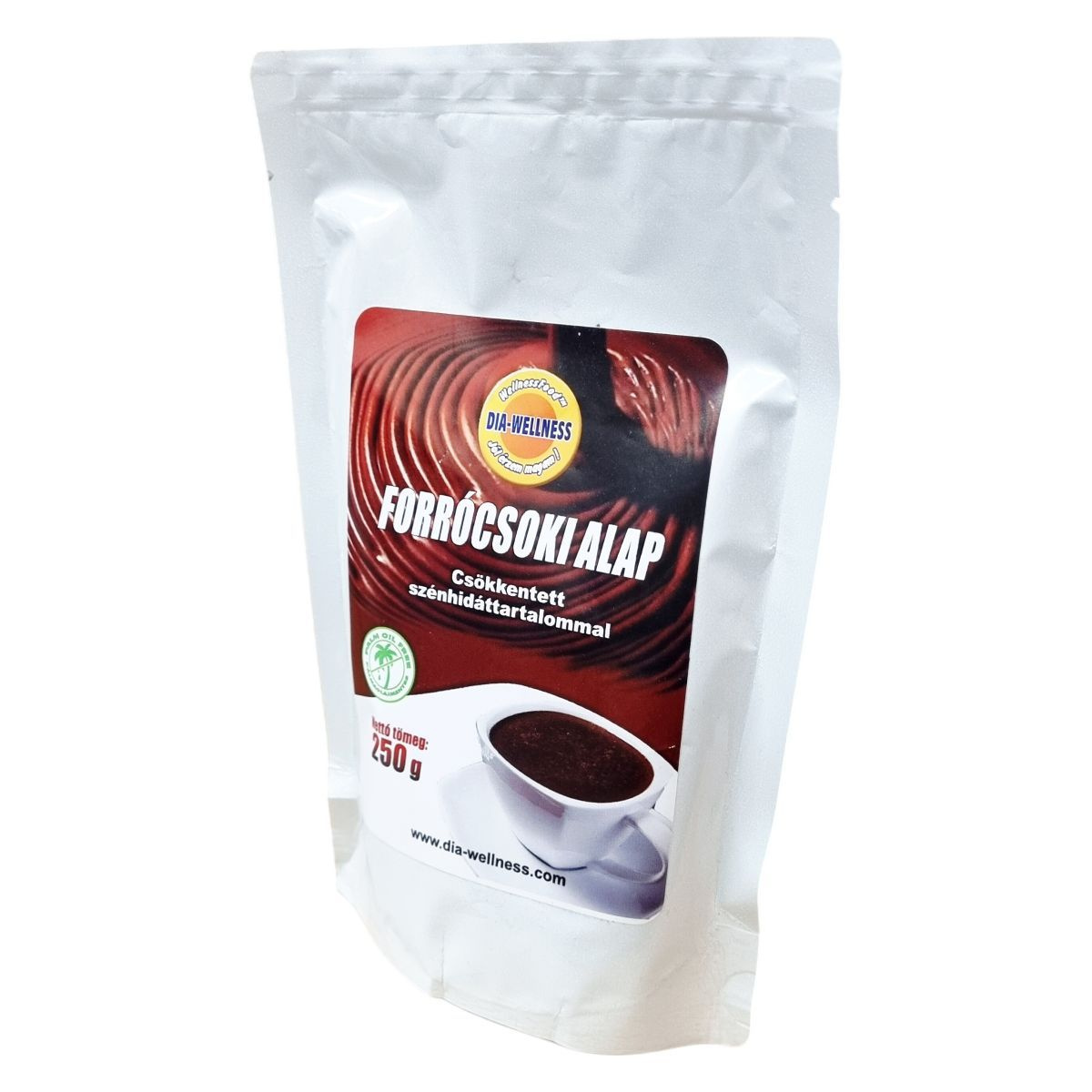 A DIA-WELLNESS forrócsoki alap egy csökkentett szénhidráttartalmú termék, amely eritrittel édesített a cukor helyett. Az eritrit használata miatt a vércukorszint fogyasztás után kisebb mértékben emelkedik, mint a hagyományos cukros termékek esetében. A termék megfelelő választás lehet azok számára, akik odafigyelnek vércukorszintjükre és egészséges életmódot folytatnak. Fontos azonban a mértékletesség, hiszen nagyobb mennyiségben hashajtó hatás jelentkezhet. A termék olyan üzemben készült, ahol földimogyorót, diófélét, tejből készült termékeket és glutént tartalmazó gabonaféléket is feldolgoznak.