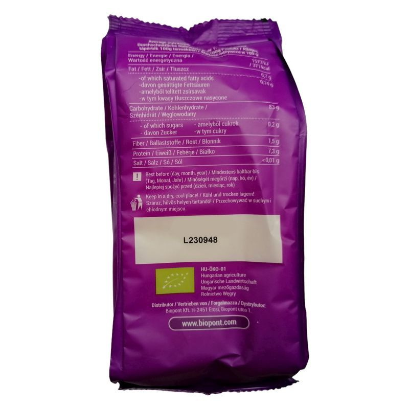 Tápanyag-információ egységenként (100 g): Energia: 1573 kJ/371 Kcal, zsír: 0,7 g -amelyből telített zsírsavak: 0,1 g, szénhidrát: 83 g -amelyből cukrok: 0,2 g, só: 0,01 g, fehérje: 7,3 g.