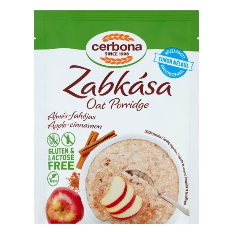 Induljon a nap gluténmentes Cerbona zabkásával! Az almás-fahéjas zabkásánk különlegessége, hogy gluténmentes zabpehelyből készül tej hozzáadása nélkül, így bátran fogyaszthatják azok is, akik glutén-, tej-, illetve laktózérzékenyek, és a vegán életmódot követők is. A termék hozzáadott cukor nélkül készül, édesítőszerrel, így bátran fogyaszthatják azok is, akiknek fontos a napi cukor bevitel csökkentése. Könnyen és gyorsan elkészíthető, tökéletes reggeli, akár otthon, akár a munkahelyen. A glutén-, és laktózmentes zabkásáink több ízben kaphatók, így mindenki megtalálja a számára legfinomabbat.