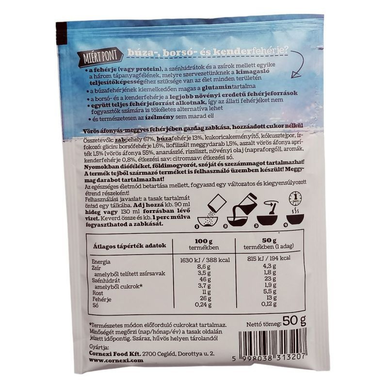 Összetétele: zabpehely 59%, búzafehérje, oligofruktóz, kukoricakeményítő, kókusztejpor, ízfokozó (glicin), borsófehérje, liofilizált meggydarabok 1,5%, aszalt vörös áfonya apríték 1,5% (vörös áfonya, ananászlé, rizsliszt, növényi olaj (napraforgó)), kenderfehérje, aromák, étkezési sav (citromsav), étkezési só.