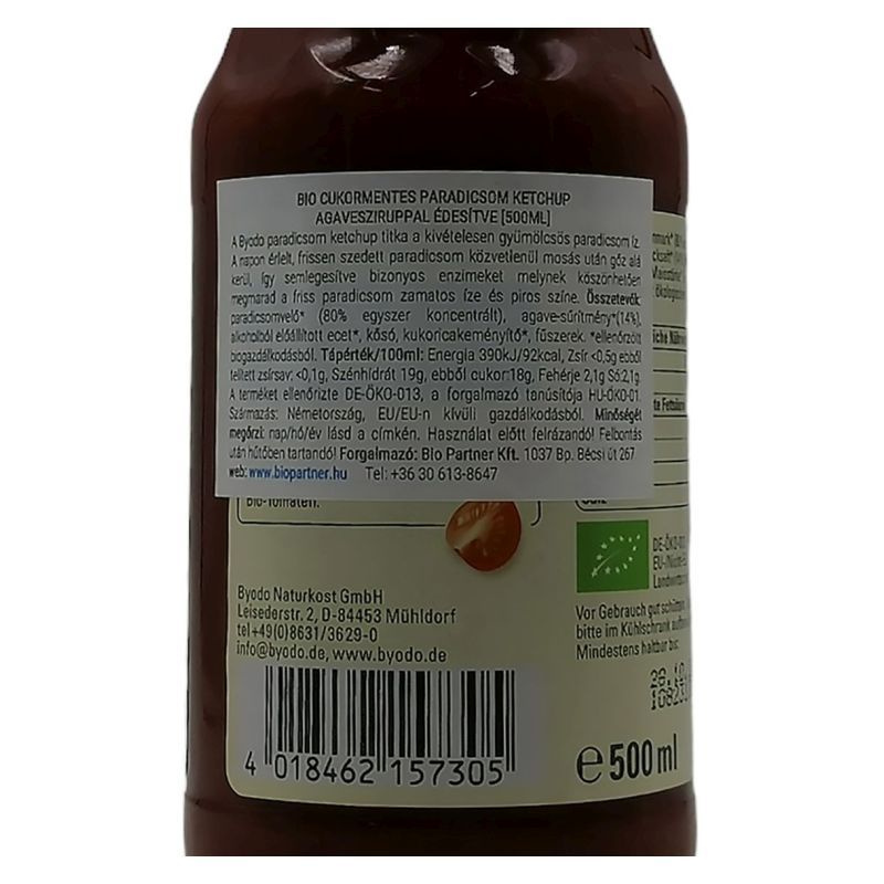 Összetevők: paradicsom (min. 150g/100g), agaveszirup, ecet, fűszerek, só.