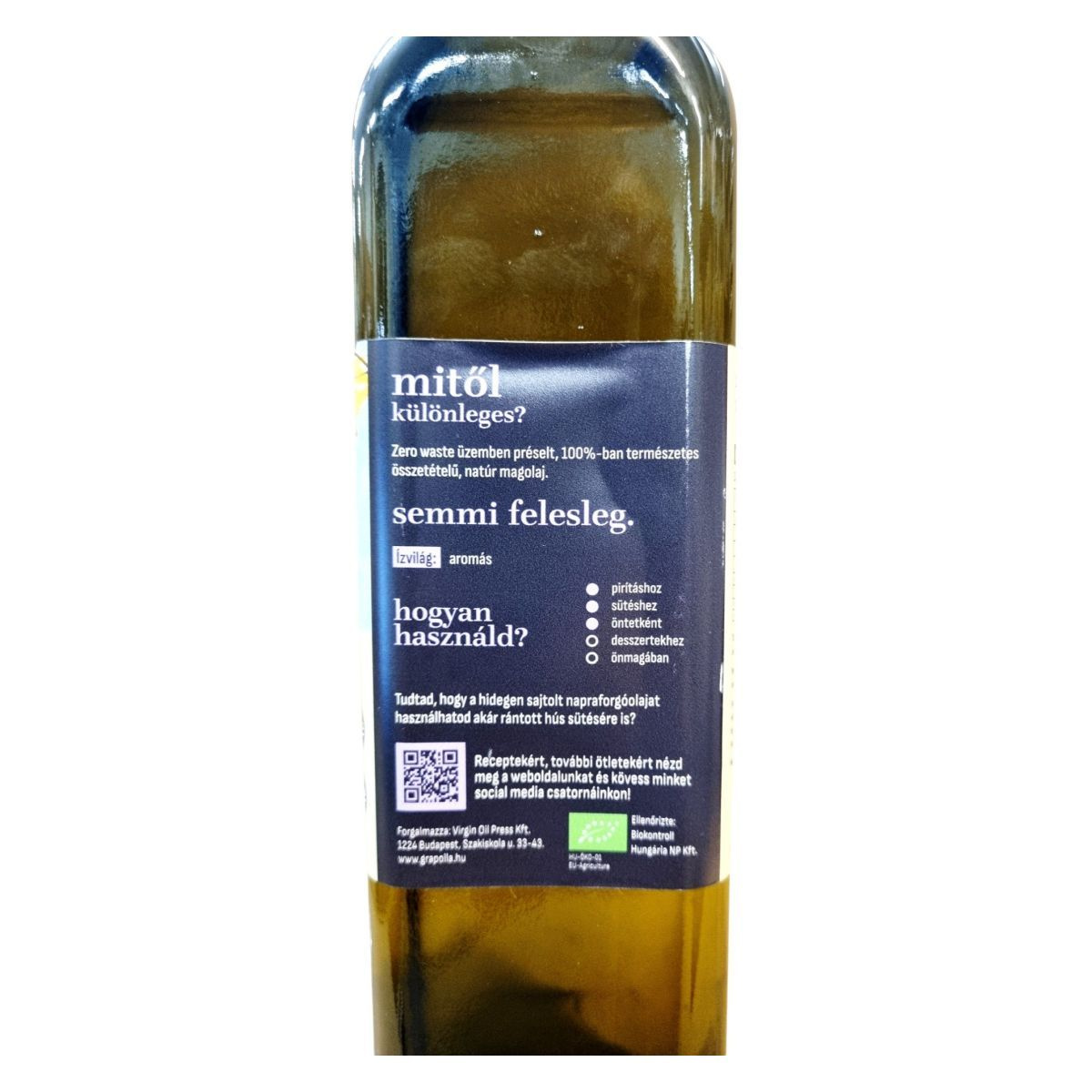 A Grapoila hidegen sajtolt napraforgómag-olaj egy 100%-ban természetes, bio termék, amely zero waste üzemben készül. Aromás ízvilágának köszönhetően sokoldalúan felhasználható a konyhában, legyen szó piritásról, sütésről, öntetekről vagy desszertekről. A termék nyomokban szezámmagot, mustármagot és dióféléket tartalmazhat, ezért allergiások számára körültekintést igényel. Tárolása fénytől és hőtől védett, száraz, hűvös helyen ajánlott, és felbontástól számítva 3 hónapon belül fogyasztandó. A termék minőségét a Biokontroll Hungária Nonprofit Kft. ellenőrizte.