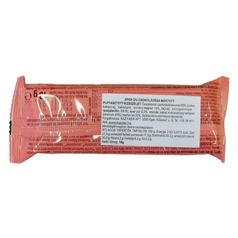 Összetevők: puffasztott barnarizs, cukor, kakaóvaj, kakaópor, sovány tejpor, emulgeálószer (szójalecitin, E476) eper por 0,3% és aromák. A csokoládé kakaó tartalma legalább 47%. Allergén anyag: szójalecitin, tejpor. Száraz és hűvös helyen tárolandó.