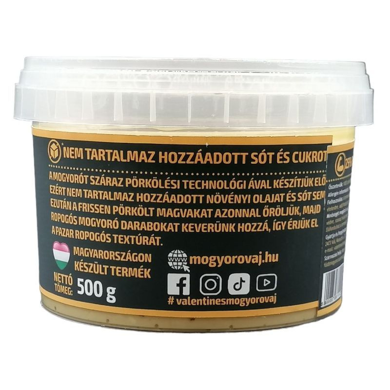 A ropogós állagú, pörkölt földimogyoróból készült mogyoróvaj hozzáadott cukor és pálmaolaj nélkül készül.