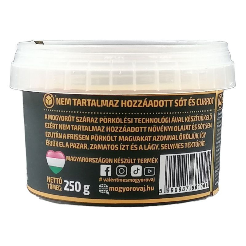 A mogyoróvaj pörkölt földimogyoróból készül, hozzáadott cukor nélkül, sima, kenhető állaggal.