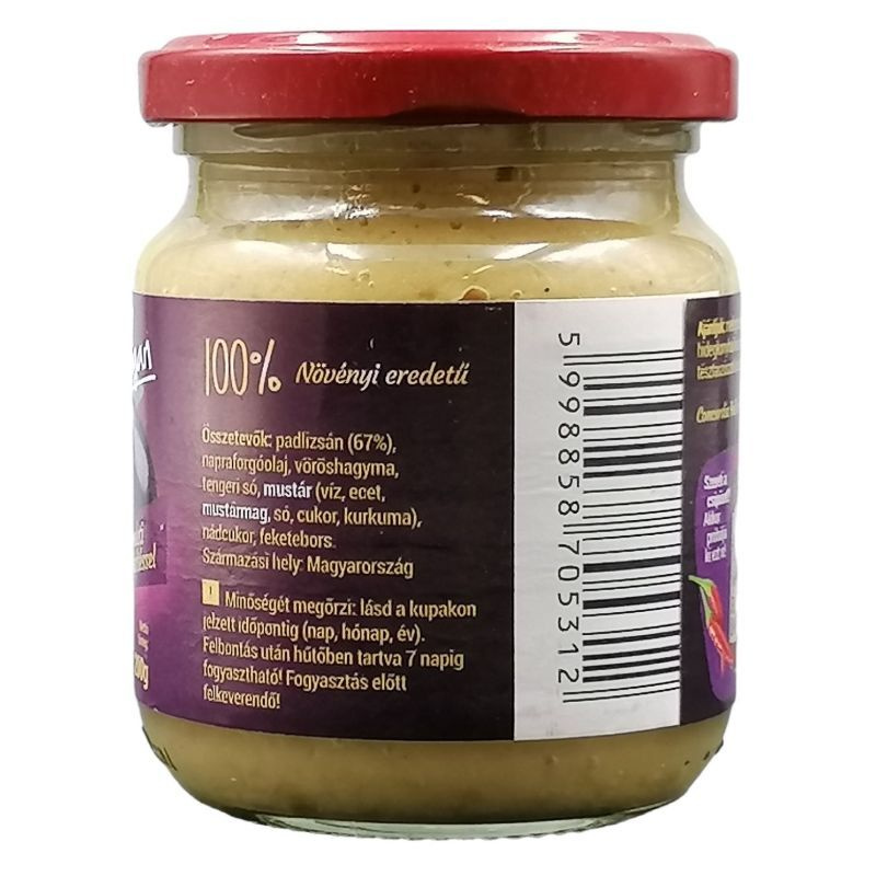 Összetevők: padlizsán (84%), napraforgóolaj, vöröshagyma, citromlé.