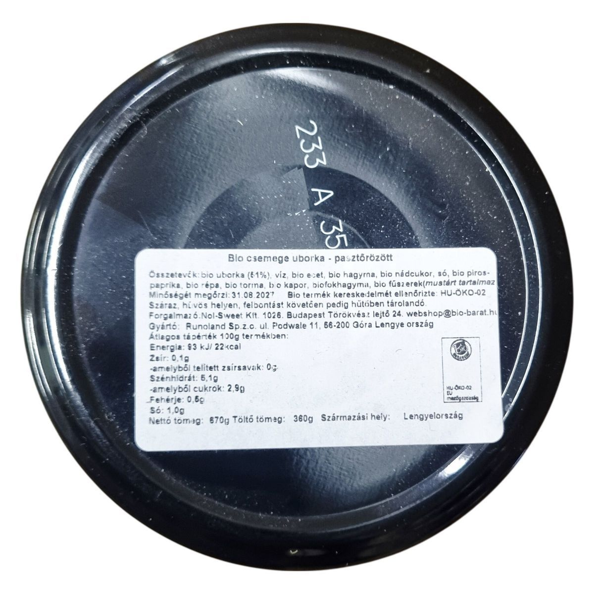 A termék Lengyelországban készült organikus összetevőkből, többek között bio uborkából, vízből, ecetből, paprikából, nádcukorból, hagymából, sóból, répából, tormából, kaporból, fokhagymából, fűszerekből (mint a mustár), melyeket tartósításhoz pasztőrözéssel kezeltek. Nettó súlya 670 g, a szűrt tömeg 360 g. A termék megfelel az Európai Unió ökológiai gazdálkodás szabályainak (PL-EKO-01) és vegán, valamint bio minősítésű. Ideális olyan fogyasztók számára, akik egészségtudatosan táplálkoznak, allergénmentesen vagy speciális étrendet követnek. Felbontás után ajánlott hűtőszekrényben tárolni, és száraz, hideg helyet igényel eredeti csomagolásban.