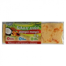 A szelet kókuszreszelékkel, szárított papayával és mangóval készül, vegán összetevőkből.