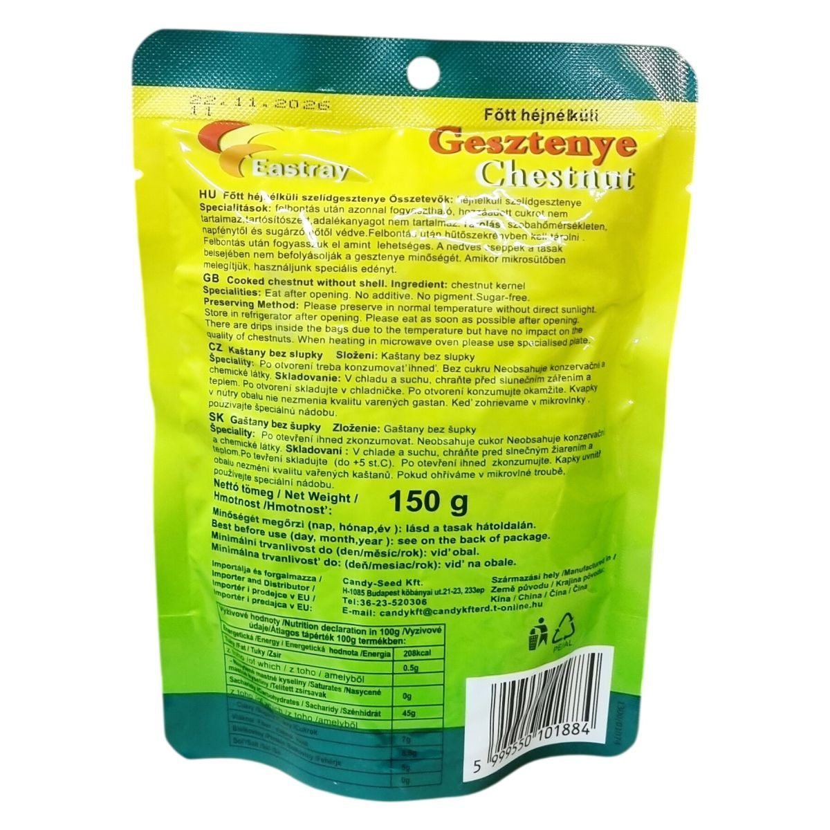 Az Eastray főtt, héj nélküli gesztenye természetes, adalékanyag- és színezékmentes termék, amely cukrot sem tartalmaz. A csomagolásból való kicsorduló nedvesség a tárolási hőmérséklet változásából adódik, de nem befolyásolja a termék minőségét. Az importálást és forgalmazást a Candy-Seed Kft. végzi, amely székhelye Budapesten található. A termék származási helye Kína. Használatkor fontos, hogy a mikrohullámú sütőben melegítéshez speciális edény kerüljön alkalmazásra a megfelelő hőelosztás érdekében.