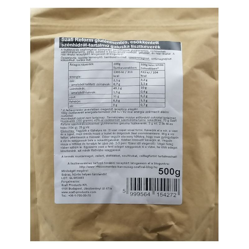 Hozzávalók (350 gramm) nokedlihez: 70 g Szafi Reform szénhidrátcsökkentett gluténmentes galuska lisztkeverék, 2 g só, 2 db M-es tojás (104 g), 25 g víz. Elkészítés: tegyünk a tűzhelyre kb. 2 liter vizet csipet sóval forrni. Keverjük el a sót, a vizet és a tojást, majd öntsük hozzá a lisztet és dolgozzuk őket csomómentesre. Míg a víz felforr, pihentessük a masszát. Ekkor vegyük alacsony hőfokra, hogy csak gyöngyözzön a víz és szaggassuk bele a nokedlit/galuskát. Közben többször keverjük át. Vegyük vissza a hőfokot és forraljuk fel újból (kb. 3-4 perc főzési idő elegendő). Végül hideg vízben szűrjük le. Egyszerre csak a fenti adagot szaggassuk ki a vízbe, ha többet adagot készítenénk, azt másik főzővízbe szaggassuk.