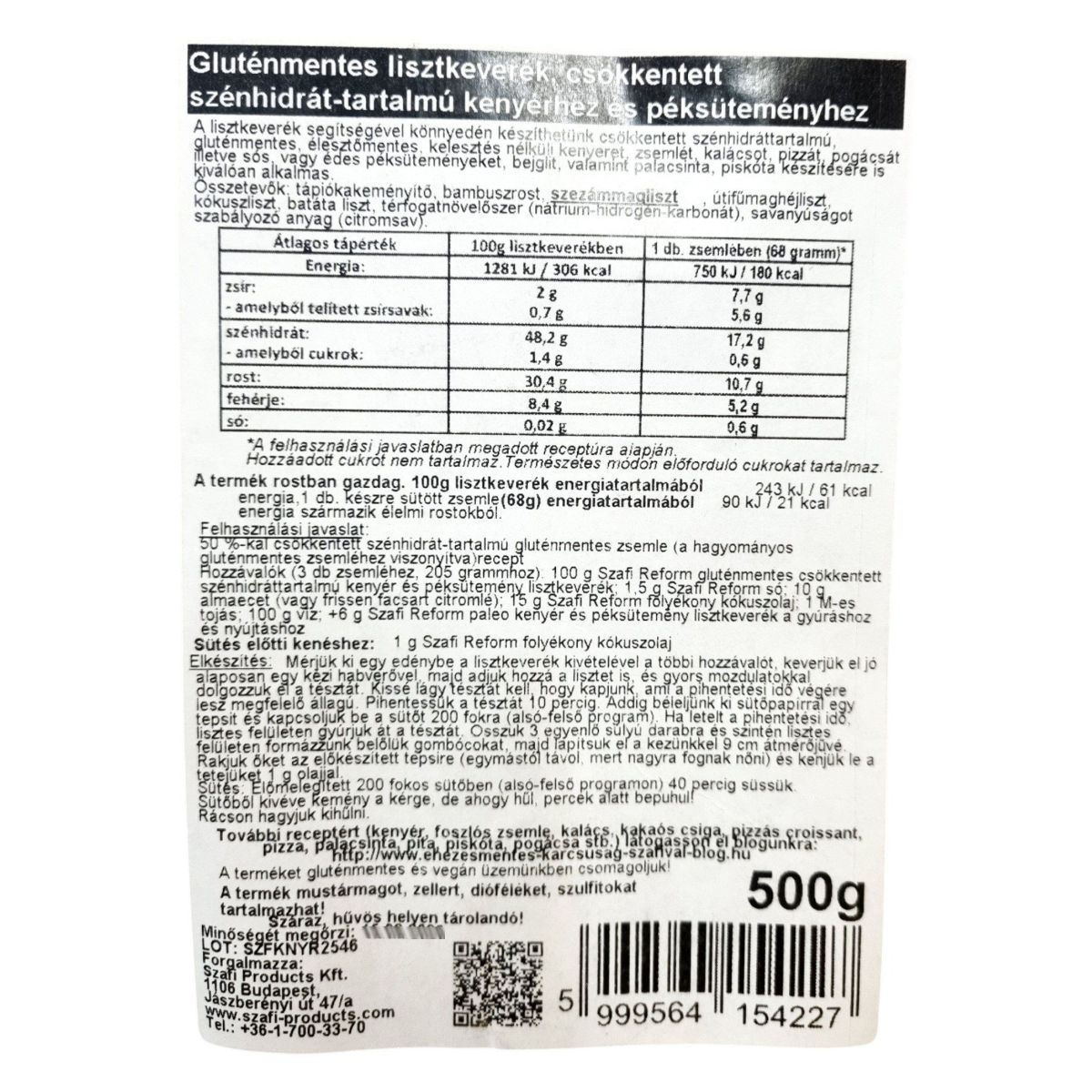 A Szafi Reform csökkentett szénhidráttartalmú kenyér és péksütemény lisztkeverék kiváló alapanyag a modern, egészségtudatos konyhában. A magas rosttartalomnak köszönhetően segíthet a kiegyensúlyozott étrend kialakításában, miközben csökkentett szénhidráttartalmával alternatívát kínál a hagyományos pékáruk helyett. A lisztkeverék gluténmentes, paleo és allergénmentes összetétele miatt számos étrendbe beilleszthető. Kelesztést és élesztőt nem igényel, így gyorsan elkészíthető kenyér, zsemle, kalács, pizza vagy sütemény is készíthető belőle. A csomagolás 500 g-os kiszerelése ideális otthoni felhasználásra, a termék megbízható magyar gyártótól származik.