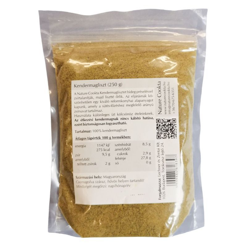 Nature Cookta kendermag liszt: a kendermagból hidegen kisajtolják az olajat és így válik lehetővé, hogy lisztté őröljék, vitaminokban, ásványi anygokban, nyomelemekben, féhérjében és rostban gazdag. Kalóri és zsírtartalma rendkívül alacsony, ideális Omega-3: Omega-6 zsírsav arány, gammalinolénsavat is tartalmaz. Gluténmentes, sokoldalúan felhasználható a liszt egy részének helyettesítésére.