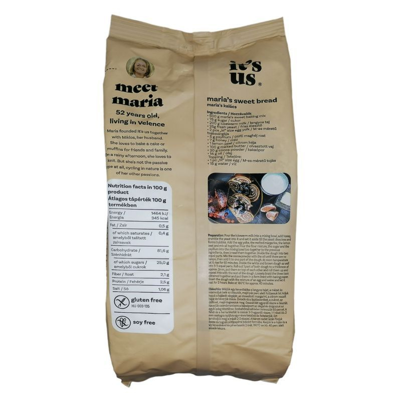 Az Its Us Marias gluténmentes sütemény lisztkeverék egy kiváló választás mindazok számára, akik szeretnék élvezni a sütemények ízét anélkül, hogy glutént fogyasztanának. Ez a lisztkeverék gondosan válogatott összetevőkből készült, amelyek biztosítják a tökéletes állagot és ízt. A gluténmentes búzakeményítő és a kukoricaliszt kombinációja lehetővé teszi, hogy a sütemények könnyűek és foszlósak legyenek, míg a dextróz és a vaníliás cukor édes ízt ad a készítményeknek. A tejpor hozzáadása gazdag ízélményt nyújt, így a sütemények nemcsak ízletesek, hanem krémes állagúak is lesznek. Ez a lisztkeverék ideális választás lehet a különféle sütemények, piskóták, muffinok és más édességek elkészítéséhez, lehetővé téve, hogy a gluténérzékeny vagy gluténmentes diétát követők is élvezhessék a sütés örömét.