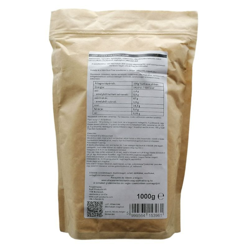 A termékeinkhez nem használunk állati eredetű termékeket, ezért szennyeződéstől mentesen garantáltan Vegán a Szafi Free termékcsalád! Összetevők: kölesliszt, tápióka keményítő, rostkeverék (útifűmaghéjliszt, bambuszrostliszt), térfogatnövelőszer (nátrium-hidrogén-karbonát), savanyúságot szabályozó anyag (citromsav). A termék szezámmagot, mustármagot, zellert tartalmazhat!