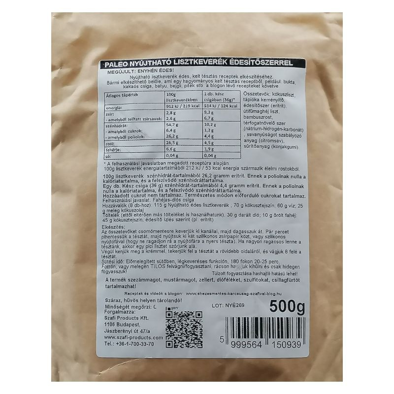 Összetevők: kókuszliszt, tápióka keményítő, édesítőszer (eritrit), útifűmaghéj liszt, bambuszrost, térfogatnövelő szer (nátrium-hidrogén-karbonát), savanyúságot szabályozó anyag (citromsav), sűrítő anyag (konjak gumi). 100g lisztkeverék energiatartalmából 212 kJ/53 kcal energia származik élelmi rostokból. 100 g lisztkeverék szénhidrát-tartalmából 26,2 gramm eritrit. Ennek a poliolnak nulla a kalóriatartalma, és a felszívódó szénhidráttartalma. Egy db. kész diós csiga (36 g) szénhidrát-tartalmából 4,4 gramm eritrit. Ennek a poliolnak nulla a kalóriatartalma, és a felszívódó szénhidráttartalma. Hozzáadott cukrot nem tartalmaz. Természetes módon előforduló cukrokat tartalmaz. A termék szezámmagot, mustárt, zellert tartalmazhat!