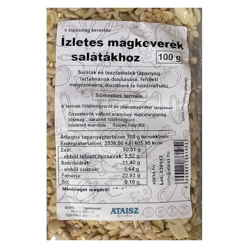 Összetevők: napraforgómag (Ukrajna), tökmag (EU), darabolt földimogyoró (EU), szeletelt mandula (EU). Allergén információ: A termék földimogyorót és olajos magvakat tartalmaz.