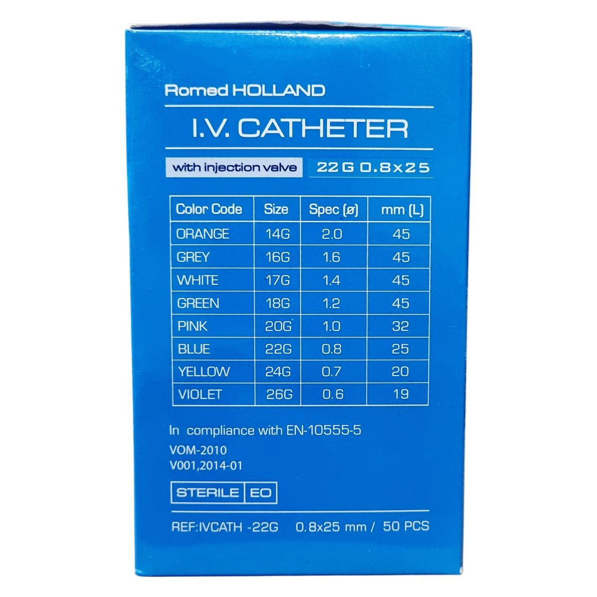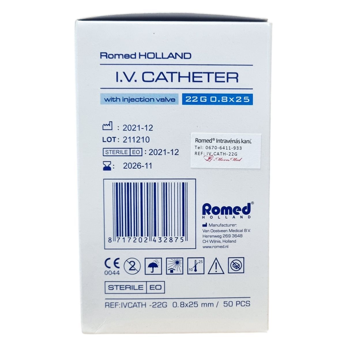 A Romed HOLLAND I.V. katéter injekciós szeleppel 22G méretben készült, 0.8 mm átmérővel és 25 mm hosszúsággal. A termék steril, etilén-oxiddal sterilizált, és kizárólag klinikai használatra alkalmas. A katéter az EN-10555-5 szabványnak megfelel, és többszörösen bevizsgált. Többféle méretben és színkódokkal elérhető, melyek az adott átmérőt és hosszúságot jelzik. A termék kizárólag egyszeri használatra készült, nem újra sterilizálható vagy használható vissza, a fertőzésveszély minimalizálása érdekében. A termék csomagolása 50 darabot tartalmaz, és megfelel az európai minőségi és biztonsági előírásoknak.