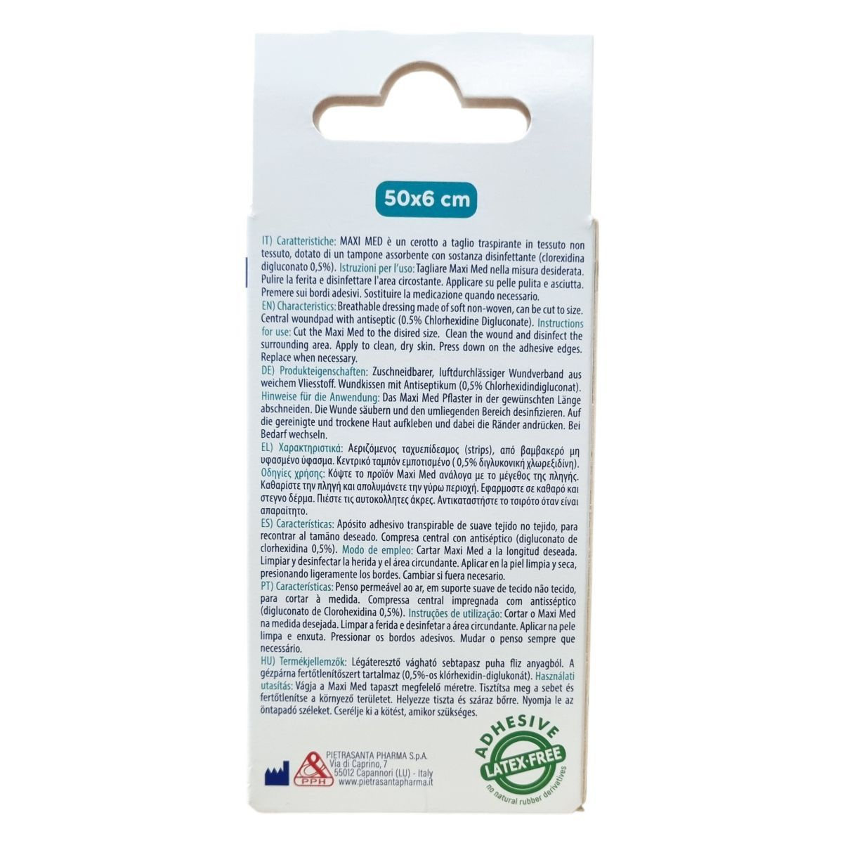 A Maxi Med egy légáteresztő, vágható sebtapasz, mely puha nem szőtt anyagból készült. Központi gézpárnája 0,5%-os klórhexidin-diglukonát fertőtlenítőszerrel van átitatva, amely segít a seb mikroklímájának szabályozásában. A tapasz méretre vágható az egyéni igényeknek megfelelően. Alkalmazása egyszerű: a sebet és környezetét meg kell tisztítani, majd a tapaszt száraz, tiszta bőrre kell helyezni és a ragasztószéleinél lenyomni. A termék latex-mentes, így allergiások számára is megfelelő. Kizárólag szükség esetén cserélje a kötést. Gyártása Olaszországban történik, szakmai forgalmazásban, patikákban kapható.