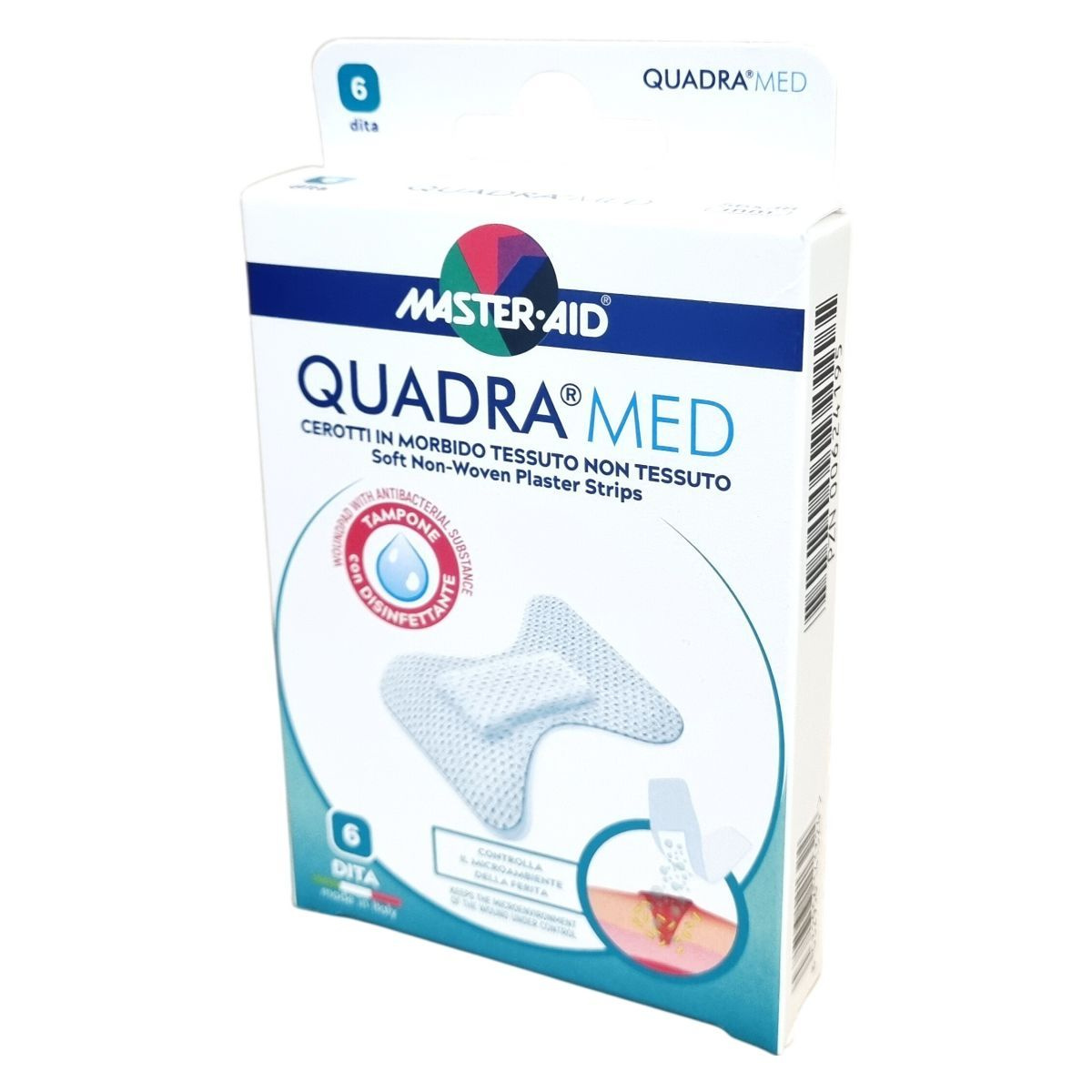 A Quadra®Med Master·Aid a professzionális sebkezeléshez készült ragtapasz-párna, amely puha, légáteresztő, nem szőtt textilből áll. A sebpárna klórhexidin-diglukonát 0,5% antibakteriális anyagot tartalmaz, amely magas nedvszívó képességgel rendelkezik, így hatékonyan védi a sebet a fertőzésektől. A tapasz ragasztóanyaga oldószermentes és hypoallergén, minimalizálva az irritáció kockázatát. Az eszköz klinikailag tesztelt, alkalmas az egészségügyi ellátás fontos eszközeként a seb mikro-környezetének kontrollálására. Használatához a seb és környezete alapos tisztítása, fertőtlenítése szükséges, az alkalmazás tiszta és száraz bőrre történik, a ragasztó szélét jól le kell nyomni. A kötést szükség szerint cserélni kell a megfelelő sebgyógyulás biztosítása érdekében. A termék hat darabos kiszerelésben, olasz gyártásban érhető el.