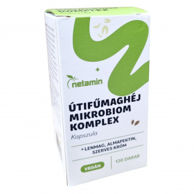 A Netamin Útifűmaghéj Mikrobiom Komplex kapszula egy speciális étrend-kiegészítő, amely útifűmaghéjat, lenmagot, almapektint és szerves krómot tartalmaz. Az útifűmaghéj segítheti a bélrendszer egészségének fenntartását, és hozzájárulhat a bélműködéshez. A króm részt vehet a normál vércukorszint fenntartásában és a makrotápanyagok normál anyagcseréjében. A termék vegán, és napi adagja 1000 mg rostot biztosít. A kapszulák bő folyadékkal, étkezés előtt fogyasztandók. Fontos, hogy az ajánlott napi adagot ne lépje túl, és az étrend-kiegészítő nem helyettesíti a vegyes étrendet és az egészséges életmódot.
