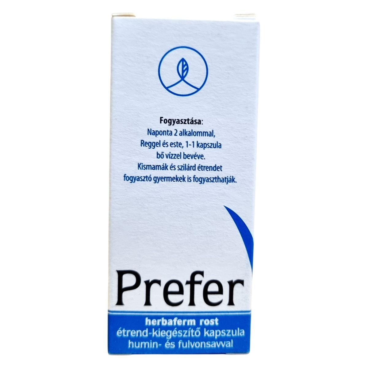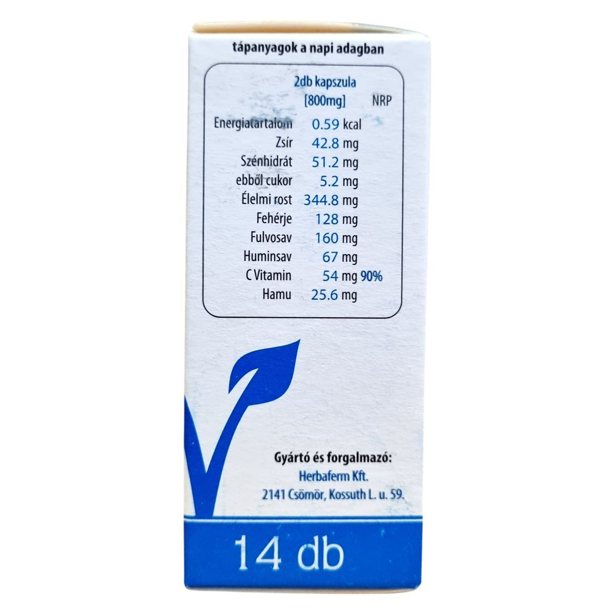 A Herbaferm rost étrend-kiegészítő kapszula egy vegán termék, amely humin- és fulvonsavval készült. A kapszula különféle gyógynövény rostokat tartalmaz, mint például matricariae flos, millefolii herba, és rosae pseudofructus. A termék napi kétszeri fogyasztása hozzájárulhat a szervezet egészséges működéséhez. A kapszulák tárolása hűvös, száraz helyen javasolt, gyermekek elől elzárva. A termék nem helyettesíti az egészséges étrendet és életmódot, és fontos, hogy az ajánlott napi mennyiséget ne lépjük túl.