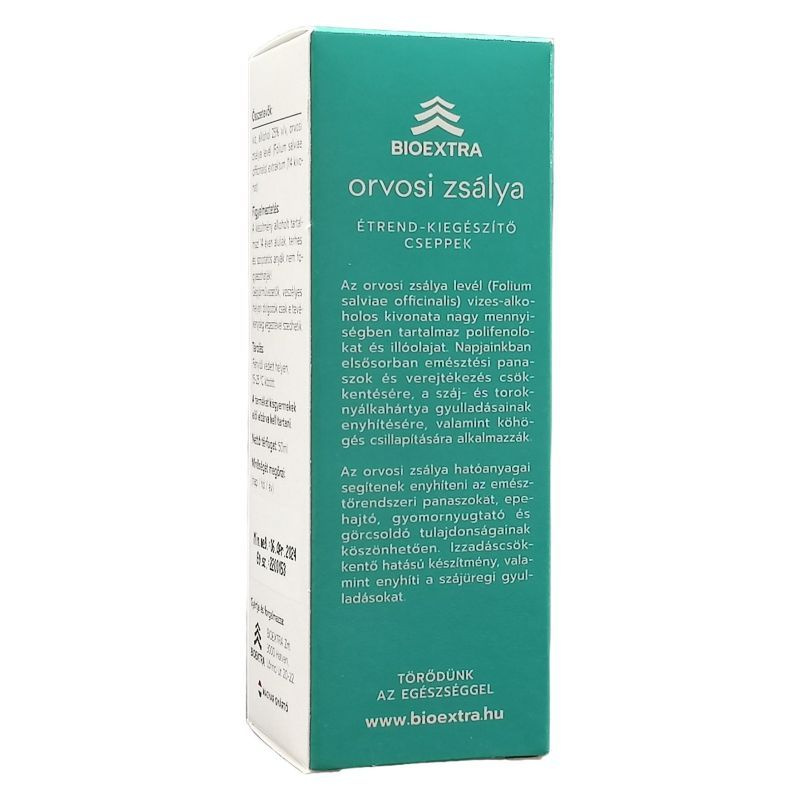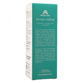 Orvosi zsálya levél vizes-alkoholos kivonata, étrend-kiegészítő készítmény. Az orvosi zsálya csepp nyugtató, emésztést segítő (epehajtó és görcsoldó), valamint izzadáscsökkentő hatású készítmény. Összetevők: Víz, etilalkohol, folium salviae officinalis (orvosi zsálya levél) extraktuma. Hatóanyag 1 egységben (1kapszula / 1tabletta / folyadékok teljes mennyisége): folium salviae officinalis (orvosi zsálya levél) extraktuma 1,8 g. Hatóanyag a napi adagban: 30 csepp = 46 mg kivonat. Notifikációs szám: 5801/2009