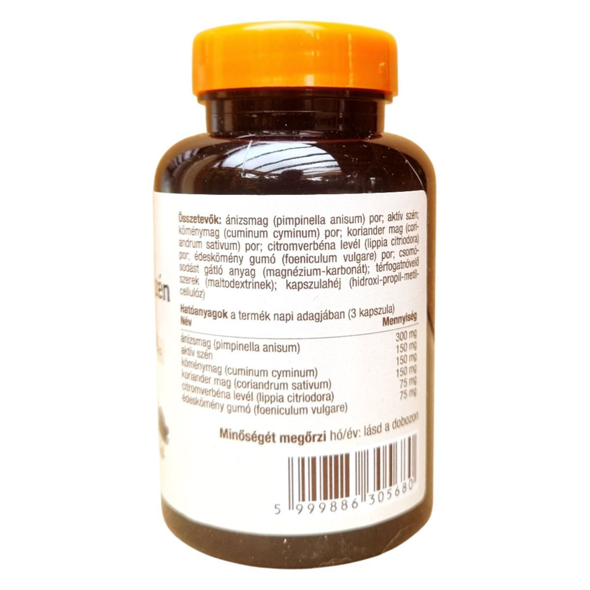 ánizsmag (pimpinella anisum) por, aktív szén, köménymag (cuminum cyminum) por, koriander mag (coriandrum sativum) por, citromverbéna levél (lippia citriodora) por, édeskömény gumó (foeniculum vulgare) por, csomósodást gátló anyag (magnézium-karbonát), térfogatnövelő szerek (maltodextrinek), kapszulahéj (hidroxi-propil-metil-cellulóz)