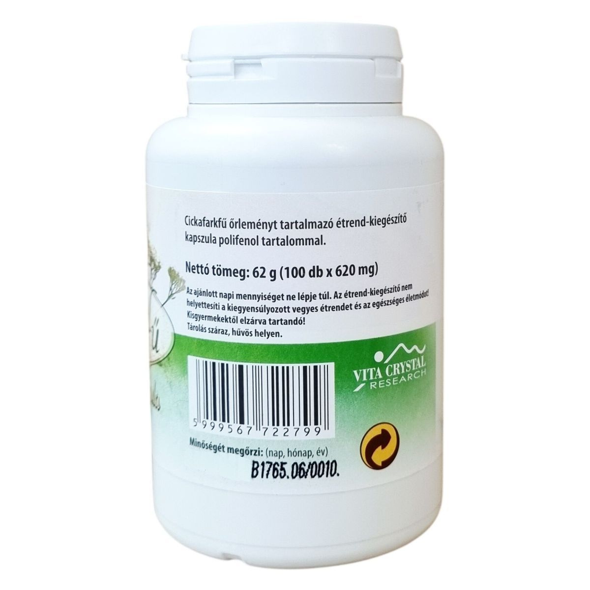 Cickafarkfű őrleményt tartalmazó étrend-kiegészítő kapszula polifenol tartalommal. Nettó tömeg: 62 g (100 db x 620 mg). Vonalkód: 5999567722799. Márkajelzés: VITA CRYSTAL RESEARCH.
