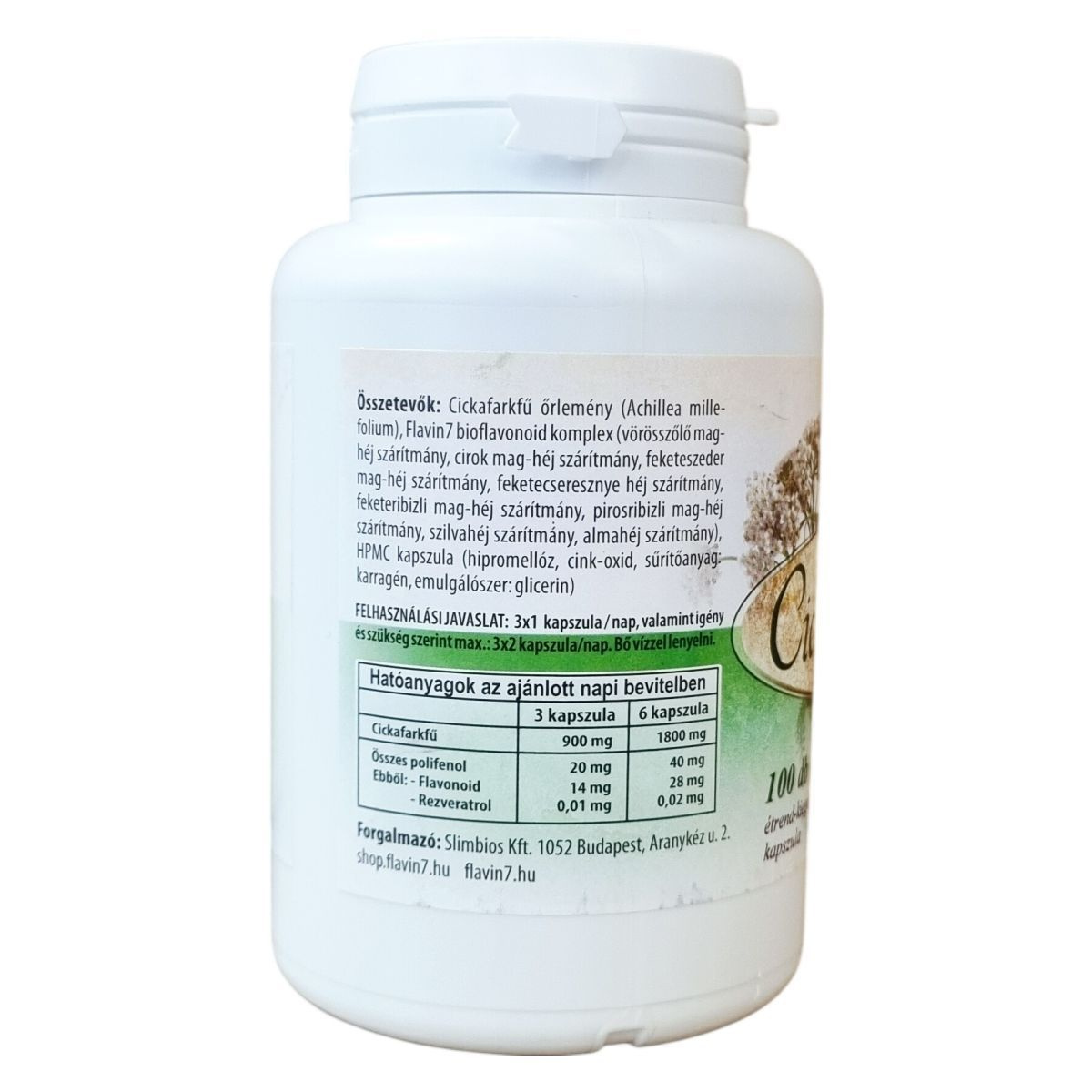 Cickafarkfű őrlemény (Achillea millefolium), Flavin7 bioflavonoid komplex (vörösszőlő mag-héj szárítmány, cirok mag-héj szárítmány, feketeszeder mag-héj szárítmány, fekete cseresznye héj szárítmány, feketeribizli mag-héj szárítmány, pirosribizli mag-héj szárítmány, szilvahéj szárítmány, almahéj szárítmány), HPMC kapszula (hipromellóz, cink-oxid, sűrítőanyag: karragén, emulgálószer: glicerin)