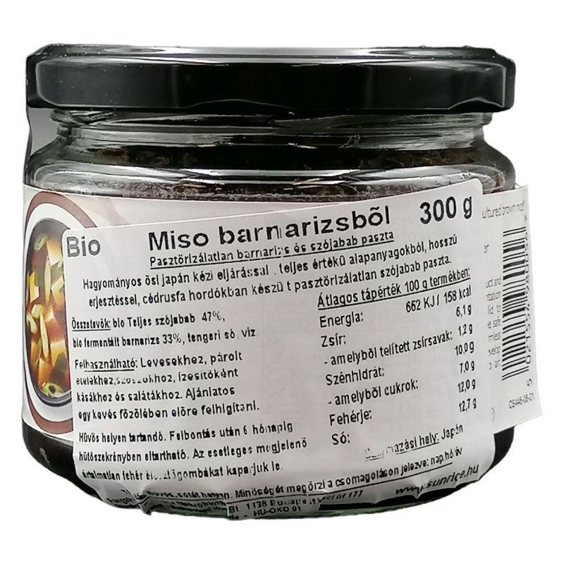 A bio minősítésű, pasztőrözetlen barnarizs- és szójababa-alapú miso hagyományos japán eljárással készül, hosszú érleléssel, természetes fermentációval. Jellegzetes, telt íze levesekhez, mártásokhoz és zöldséges ételekhez ajánlott.